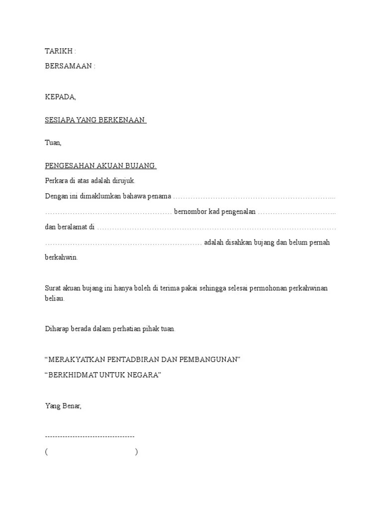 Nikah Borang Akuan Bujang : Surat Akuan Bujang Untuk Kahwin Letter 7saudara Com. Dapatkan surat pengesahan berkahwin daripada kedutaan pasangan warga asing . Mendapatkan borang permohonan nikah di pejabat agama islam daerah atau klik di. Sebelum mengemukakan borang permohonan pendaftaran perkahwinan. Permohonan pengesahan taraf perkahwinan untuk kegunaan di dalam negara bagi. 5, borang permohonan kad perakuan nikah, alt. Rekod ujian saringan hiv (hanya di klinik kerajaan sahaja). 3, borang pengesahan tempat tinggal, alt.